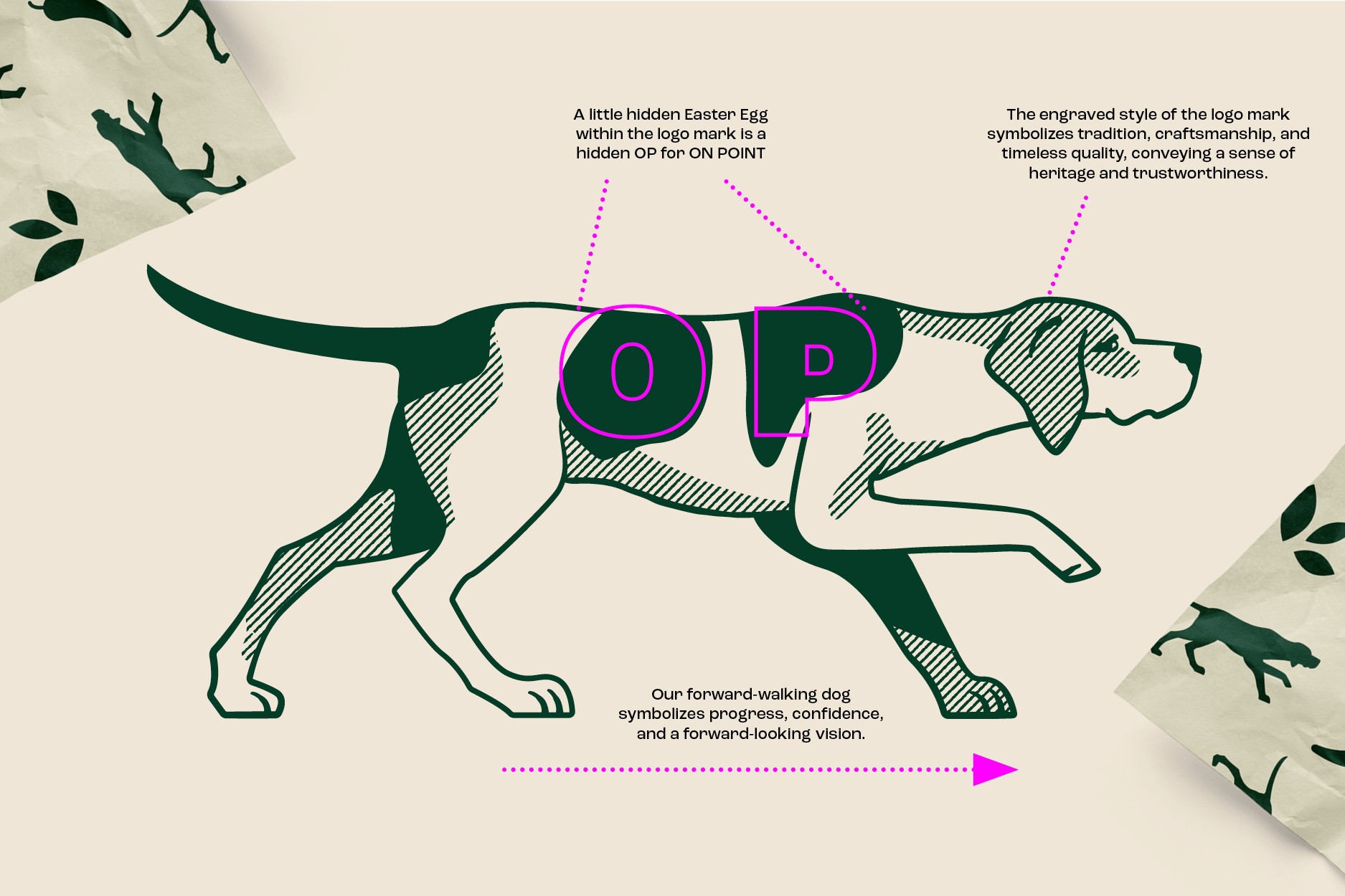 The resulting brand identity captured the essence of On Point Provisions through a carefully crafted combination of storytelling, design, and strategy: The brand's centerpiece is the On Point Dog, a graphic engraved-style illustration that embodies the brand’s focus and precision. This logo is more than a visual—hidden within the dog's markings are an O and P, subtly nodding to the brand name. This Easter Egg adds a playful layer of discovery, reinforcing the brand's innovative spirit. The branding for On Point Provisions bridges the gap between tradition and innovation, creating a versatile identity that resonates with a wide audience. The dog logomark has become an emblem of the brand’s commitment to excellence, while the vibrant color palette and elegant typography evoke the excitement of bold, unforgettable flavours.